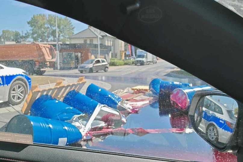 TARCZYN Na rondzie przy ul. 1 Maja doszło do nietypowej kolizji. Z auta przewożącego sok lub koncentrat wiśniowy spadło 8 beczek.