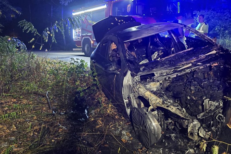 GÓRA KALWARIA Do niecodziennej kolizji doszło w Krzakach Czaplinkowskich. Mercedes jadący ulicą zjechał z jezdni i uderzył w drzewo, po chwili auto stanęło w ogniu