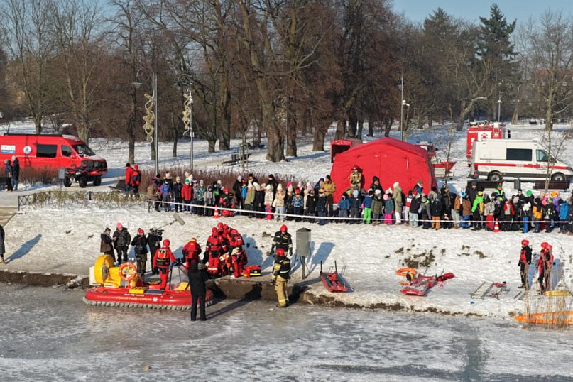 PIASECZNO Nad stawem przy parku miejskim w Piasecznie w ostatni wtorek odbyły się ćwiczenia i pokazy ratownictwa wodnego, których celem było uświadomienie najmłodszym mieszkańcom gminy, jak bezpiecznie spędzać ferie zimowe.