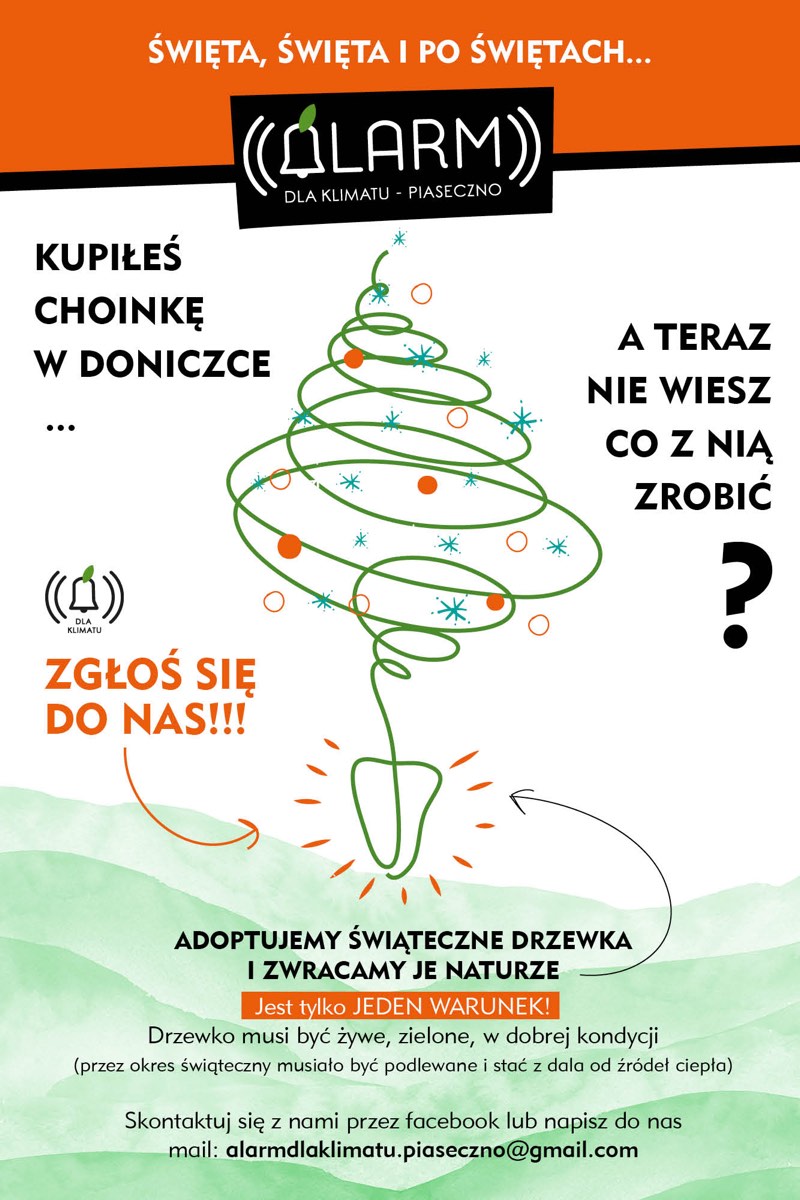 Jeśli jesteś szczęśliwym posiadaczem choinki w doniczce, a nie masz gdzie jej zagospodarować i nie chcesz by stała się zielonym odpadem, to zgłoś się do nich (Alarm dla Klimatu Piaseczno: www.facebook.com, mail: [email protected]). Jest jeden warunek: drzewko musi być żywe, zielone oraz w dobrej kondycji (przez okres świąt było podlewane i stało z dala od źródeł ciepła). Zasadźmy razem poświąteczny las choinek! Akcja trwa do 17 stycznia 2020 roku.