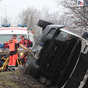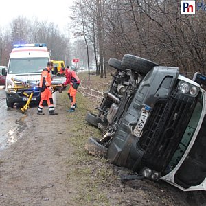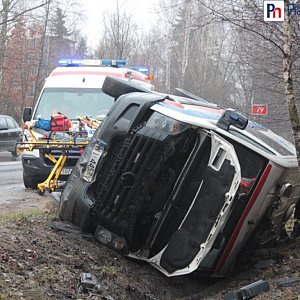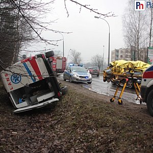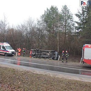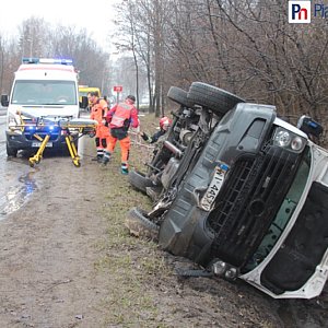 Kierowca karetki chciał ominąć kałużę i stracił panowania nad kierownicą. Samochód zjechał do rowu i przewrócił się na bok.