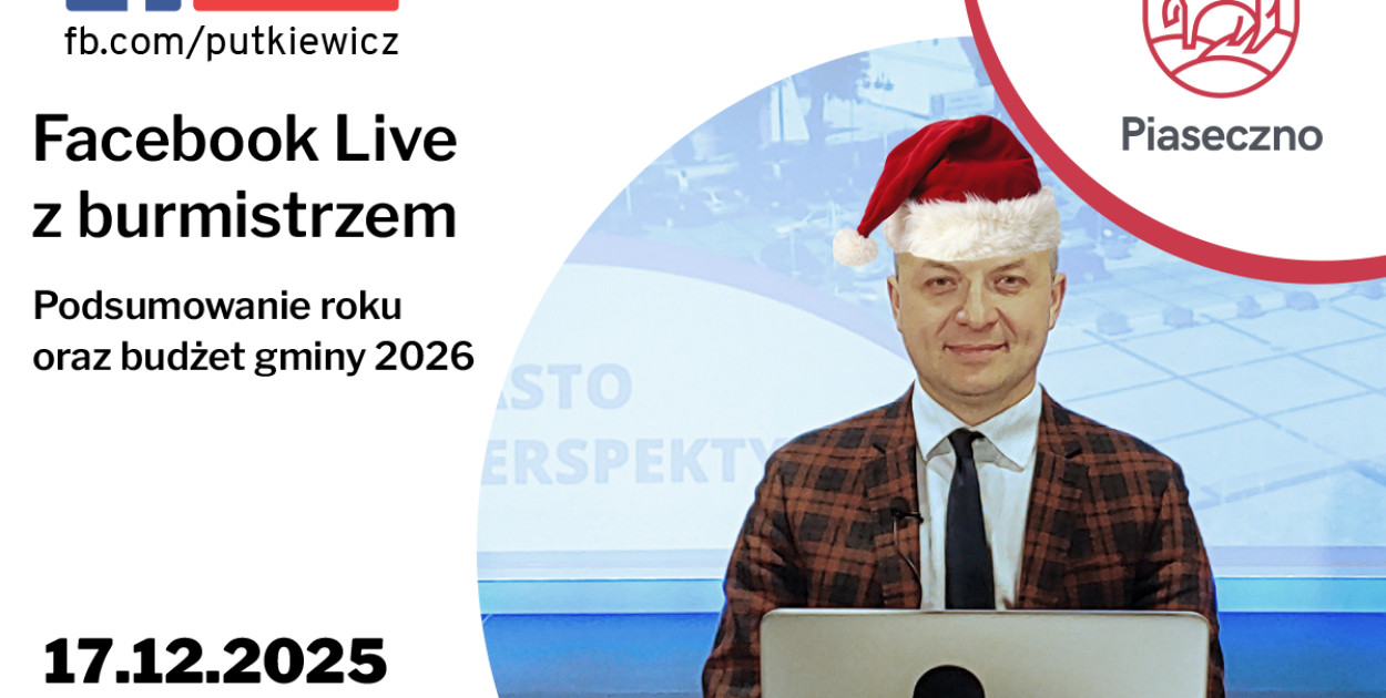 Ostatni tegoroczny live z burmistrzem Piaseczna zaplanowany jest w najbliższą środę 17 grudnia 2025 r. Tego dnia odbędzie się też sesja budżetowa, więc podczas spotkania online burmistrz Daniel Putkiewicz podsumuje dobiegający końca rok i krótko przedstawi plany inwestycyjne na 2026 r. Transmisja rozpocznie się o godz. 17.00 na kanale Daniel Putkiewicz. Zachęcamy do zadawania pytań w trakcie transmisji live na FB.