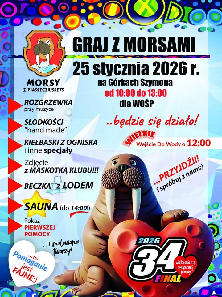 Już 25 stycznia 2026 roku mieszkańcy Piaseczna i okolic będą mieli okazję połączyć zimową zabawę z pomaganiem. „Morsy z Piassecziussets”, we współpracy ze sztabem WOŚP Piaseczno, organizuje wyjątkowe wydarzenie charytatywne pod hasłem „Graj z Morsami”, które odbędzie się na Górkach Szymona, przy górce saneczkowej.