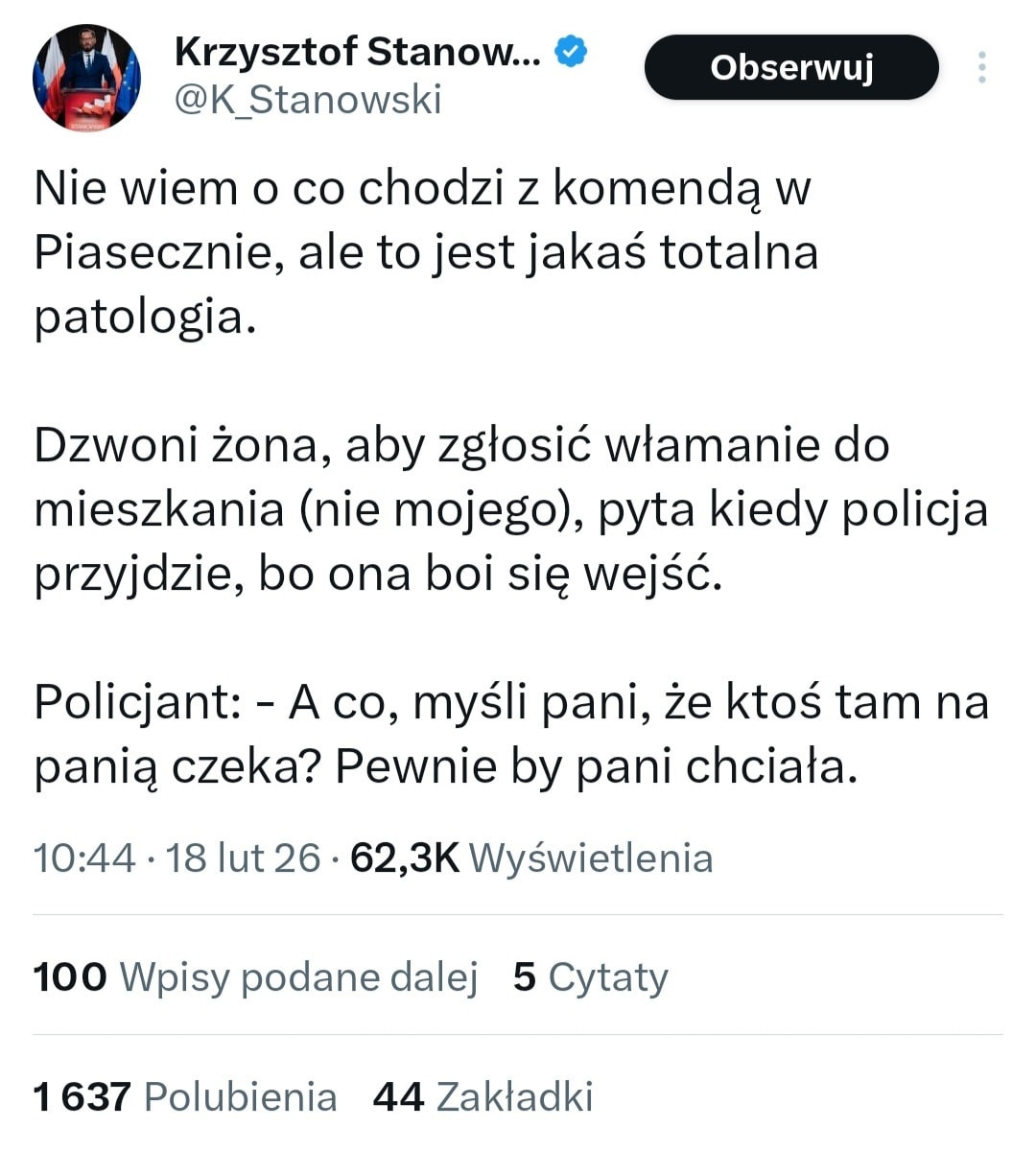 W swoim wpisie Stanowski napisał, że jego żona miała obawiać się wejścia do mieszkania, w którym doszło do włamania, i sugerował, że dyżurny miał odpowiedzieć: „Pewnie by Pani chciała.” Wpis został szeroko udostępniony w mediach społecznościowych, wywołując liczne komentarze internautów.