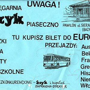 Podstawą naszej działalności była sprzedaż muzyki i książek, ale by utrzymać się na rynku próbowaliśmy też urozmaicać nasz asortyment - mówi Zbigniew Mucha i i pokazuje plakat "Bzyka" z 1991 roku, na którym reklamowana jest sprzedaż biletów autokarowych na zagraniczne wyjazdy. -