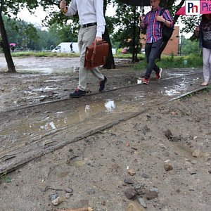 Dojście na peron suchą nogą jest w tej chwili niemożliwe. Ci, którzy założyli dziś kalosze wygrali. Ludzie w eleganckim obuwiu przegrali sromotnie, ci z wyższymi obcasami polegli tracąc równowagę na o torze. Na torze? Tak na torze. Droga na peron przypomina pokonywanie ścieżki sprawnościowej - jeden z odcinków trzeba pokonać idąc po torze. Gdy się straci równowagę, wpada się w błoto. Widok ludzi z parasolkami w ręku, łapiących równowagę przypominał taniec na linie początkującego akrobaty. Niektórzy nie wytrzymywali i zaczynali się gorzko śmiać.
