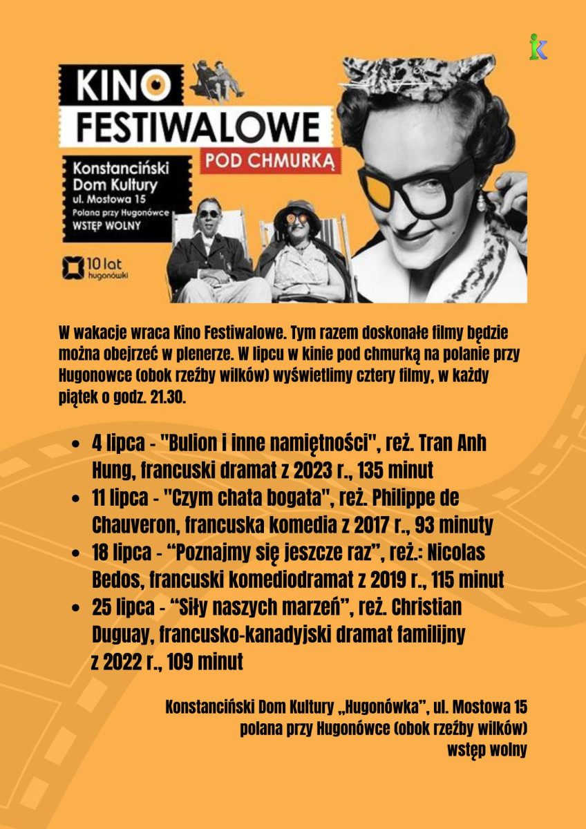 W wakacyjne piątki ponownie będziemy mogli cieszyć się wyjątkowym doświadczeniem filmowym pod gołym niebem. Kino Festiwalowe wraca w letniej odsłonie – Kino pod Chmurką – i zaprasza na cykl pokazów plenerowych na polanie przy Hugonówce, tuż obok rzeźby wilków. W każdy piątek lipca o godz. 21:30 na widzów czekać będzie znakomite kino, które rozgrzeje nie tylko letnie wieczory, ale i serca.
