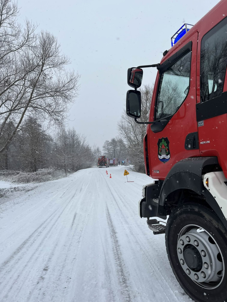 Jak informują strażacy, kierowca nie odniósł obrażeń. Droga w miejscu zdarzenia była mocno oblodzona, a warunki jazdy — wyjątkowo trudne.
