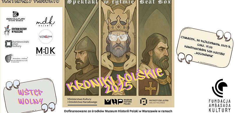 KONSTANCIN-JEZIORNA Konstancin-Jeziorna ożywi średniowieczną historię Polski w nowoczesnym wydaniu – 30 października w Hugonówce odbędzie się spektakl mobilny „Kroniki Polskie 2025”, łączący opowieść Galla Anonima z muzyką na żywo i beatboxem.